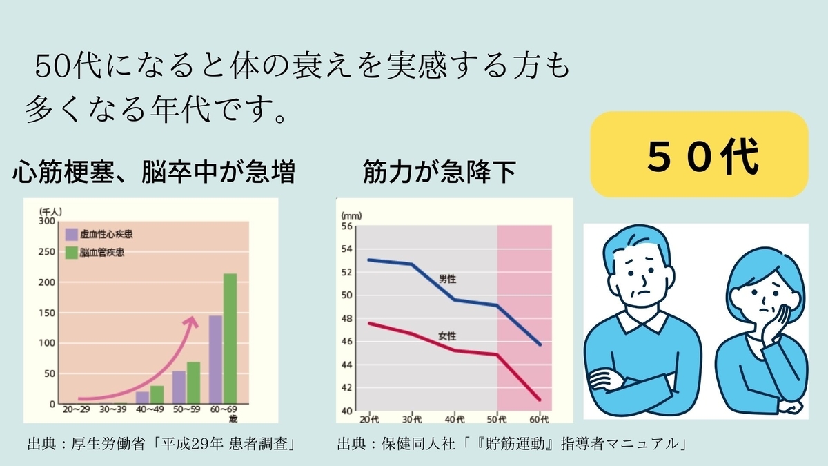 50代は心筋梗塞や脳卒中を発症が増えはじめるタイミングであり筋力が急降下する年代でもあります。