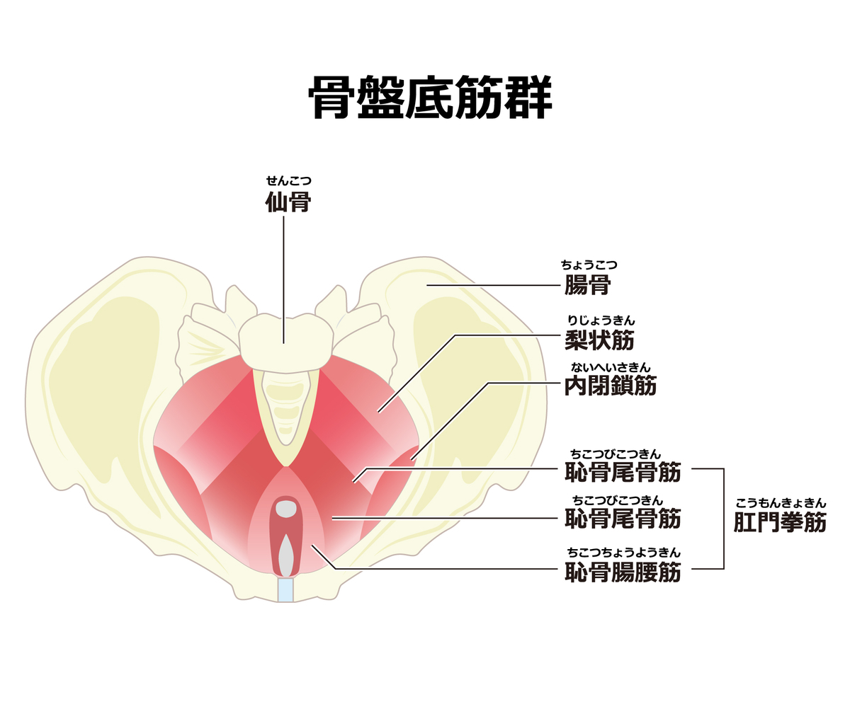 骨盤底筋とは骨盤の底にある筋肉で骨盤内にある膀胱や子宮、直腸などの臓器を正しい位置に保ったり、尿道を締めて尿漏れを防ぐなど重要な役割を担っています。